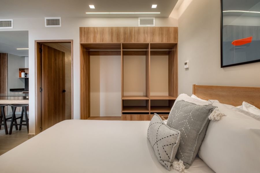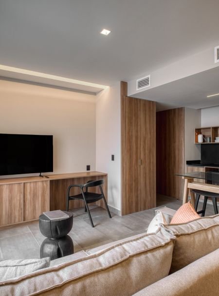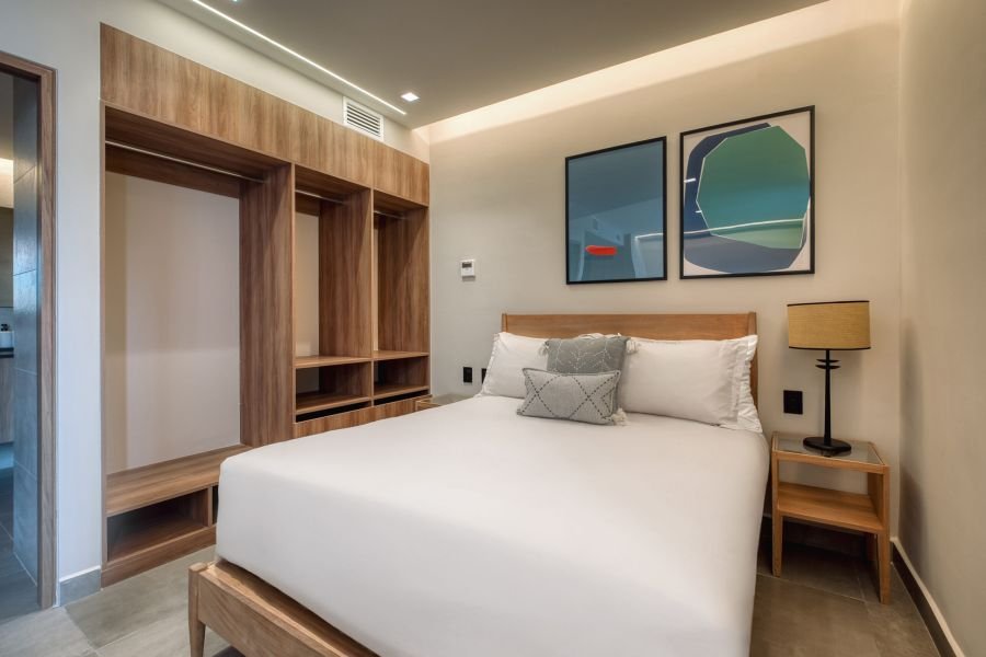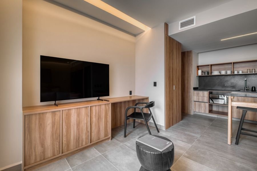 The suite includes a bedroom with a Queen bed, a welcoming living room, and a kitchen to cook and share meals. One of the Queen units includes a sofa bed, while others focus on a streamlined, comfortable design — ideal for couples or solo travelers.